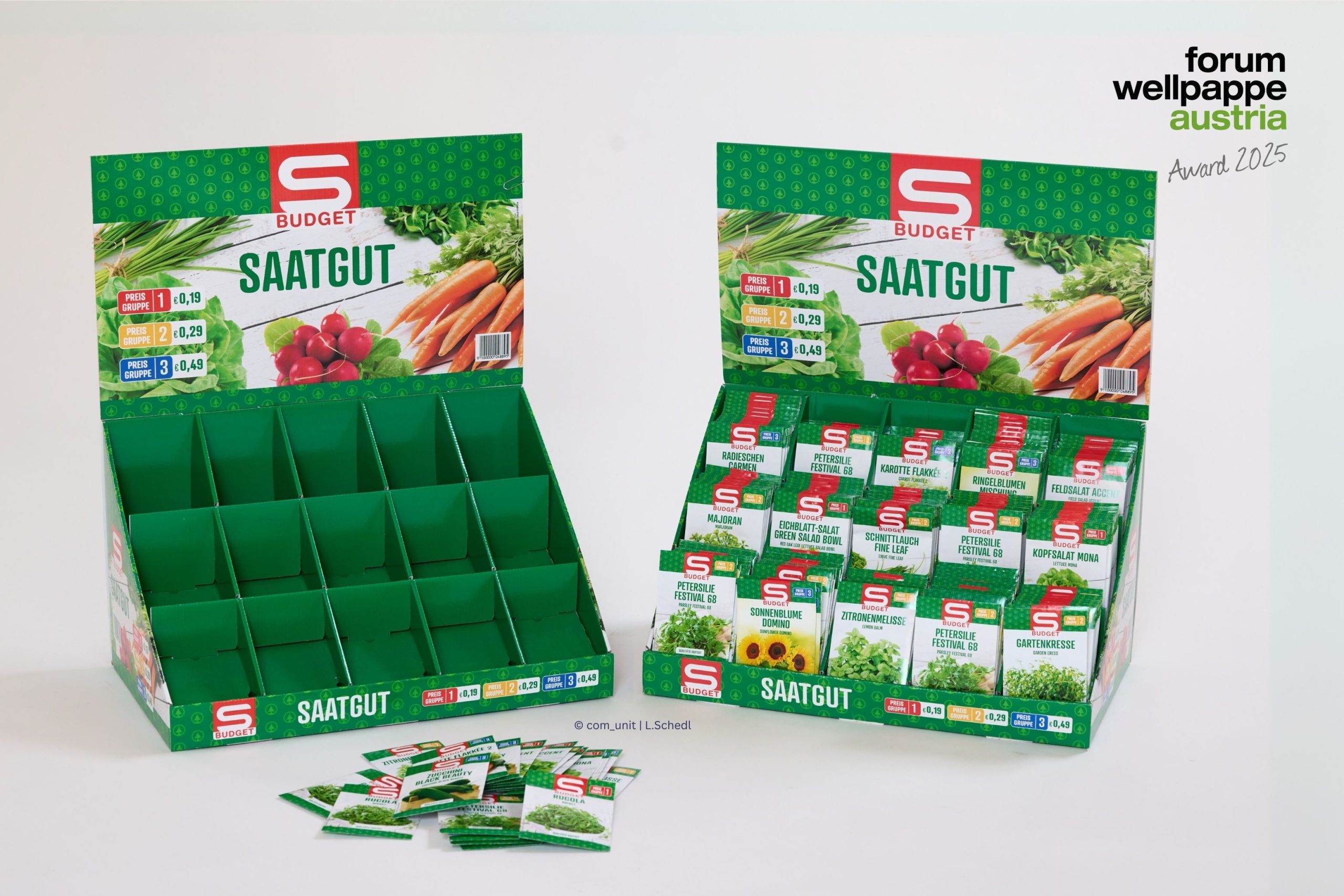 This counter display made of corrugated board brings plant seeds to life at the supermarket. Its upward-slanted layout ensures every variety is easy to see, making selection quick and intuitive for customers.